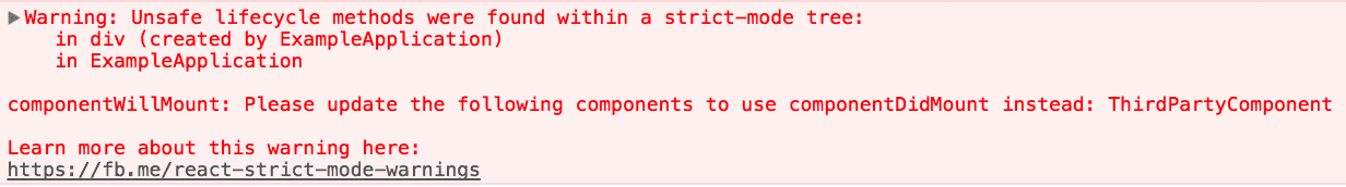 當嚴格模式被打開的時候,React 編譯了一整串用到這些不安全生命週期的 class component,然後記錄了這些 component 的警告訊息,例如: