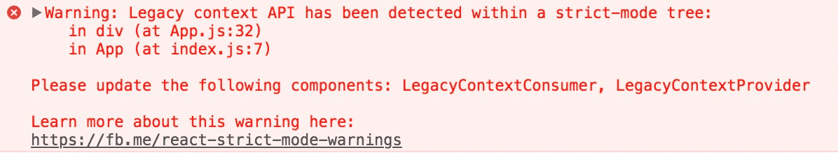 Legacy context API 是容易出錯的,並將在以後的主要版本中刪除。它仍然適用於所有 16.x 版本,但將在嚴格模式下顯示以下警告訊息: